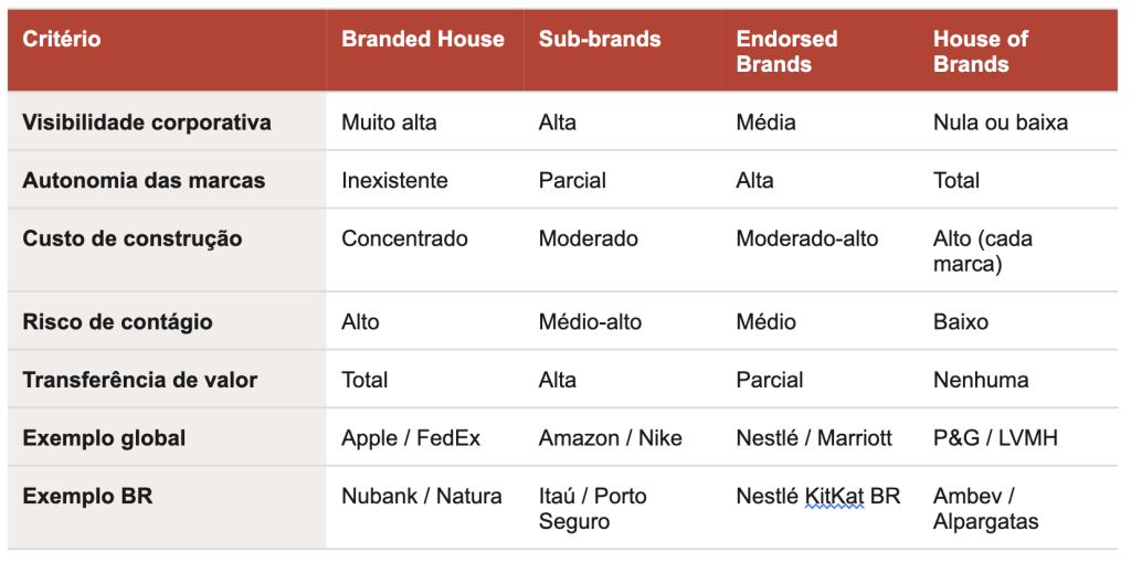 Cada ponto no espectro representa uma decisão de onde concentrar o investimento de marca, quanto risco de contágio aceitar e quanto valor a empresa quer extrair do nome corporativo.