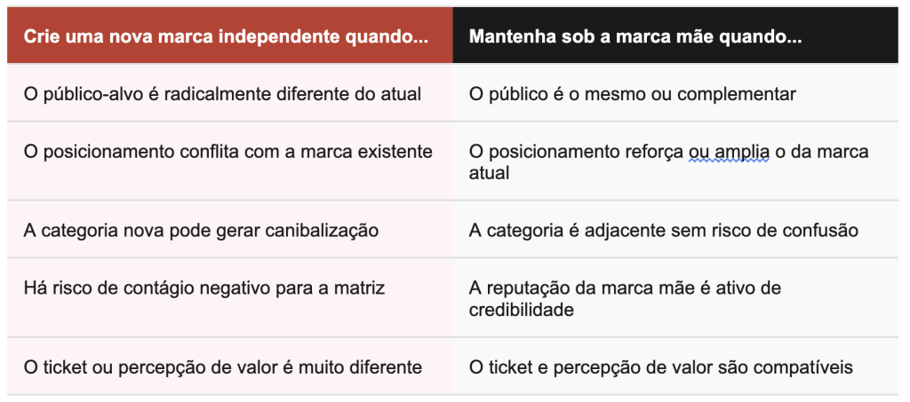 Regra prática: antes de criar uma nova marca, pergunte se você tem orçamento, time e disciplina para construí-la por pelo menos três anos. Se a resposta for não, encontre outro ponto no espectro de Aaker antes de criar uma marca independente.