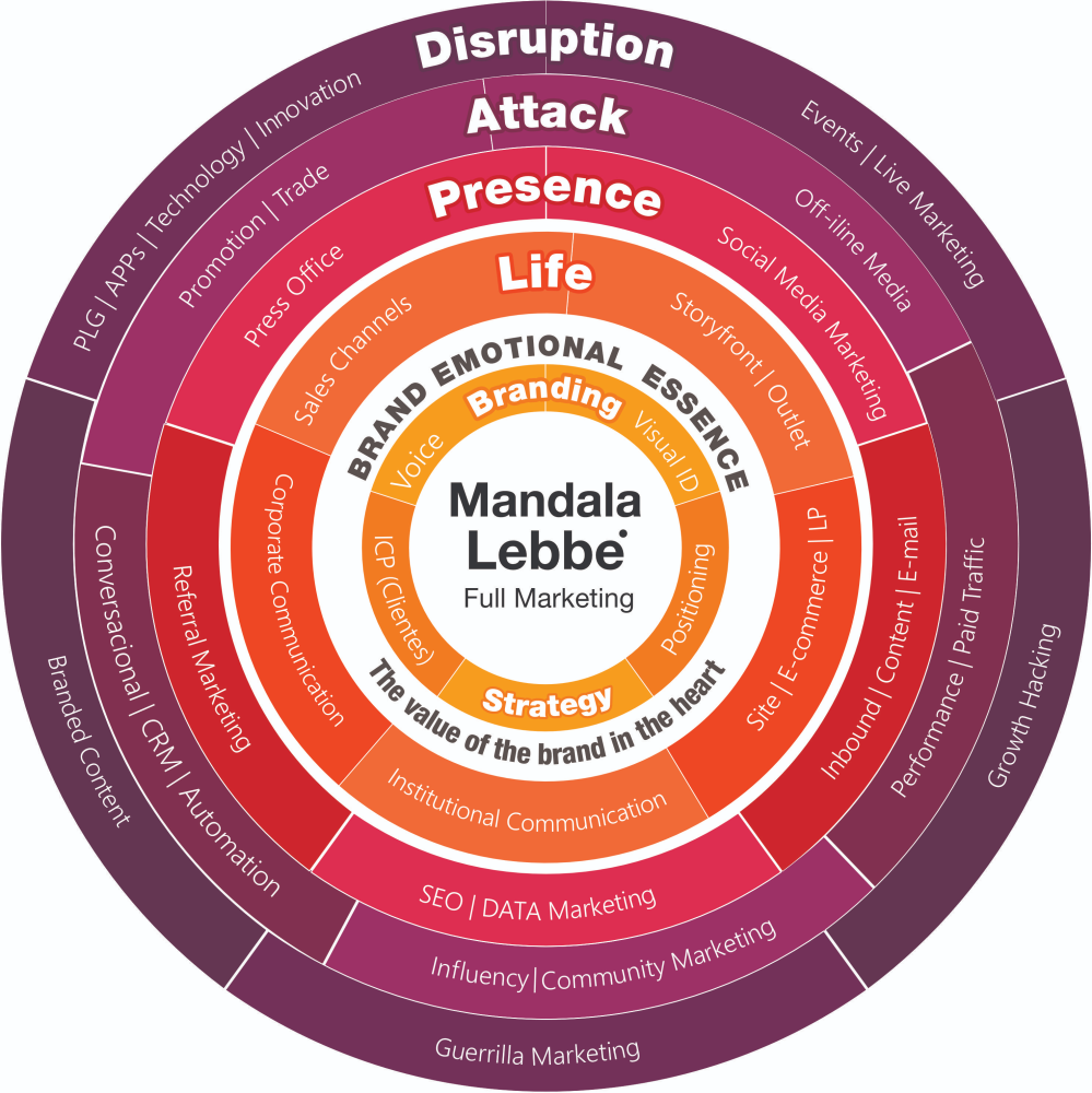 Na Mandala Lebbe, o branding é o núcleo. Ele define a identidade, o propósito e os valores que orientam todas as camadas externas. Quando uma empresa tem múltiplas marcas, esse núcleo precisa ser definido para cada uma delas.