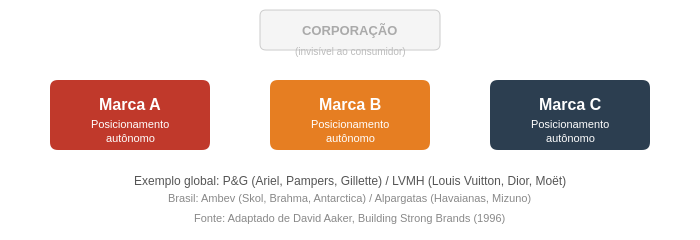 No extremo direito do espectro, a corporação é praticamente invisível para o consumidor. Cada marca opera com identidade, posicionamento e público completamente autônomos.